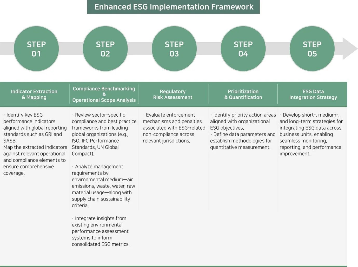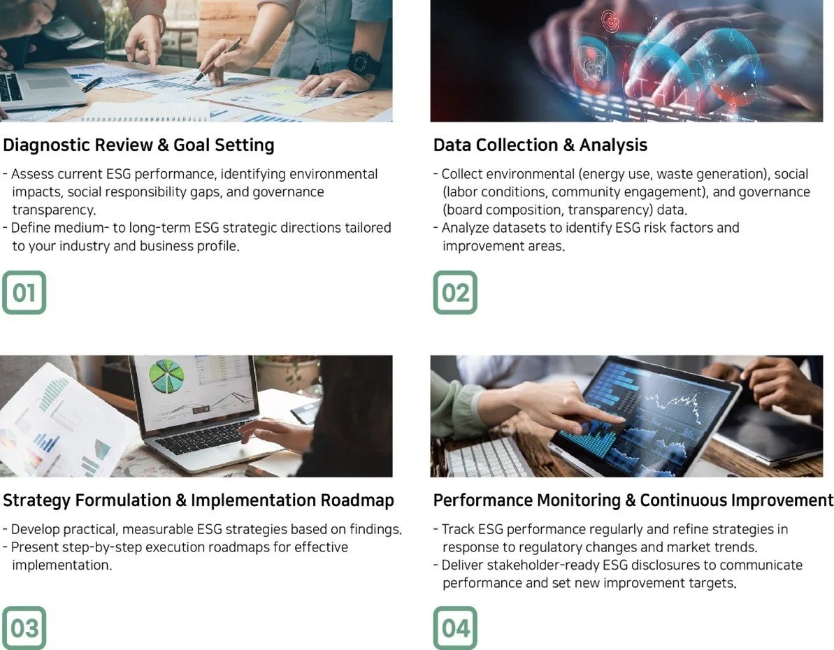 Our ESG consulting services deliver strategic frameworks and actionable implementation plans to maximize corporate performance across the Environmental, Social, and Governance pillars. We assess your organization’s ESG maturity, build robust sustainability management systems, enhance competitiveness, and guide you toward compliance with regulatory requirements as well as evolving market expectations.